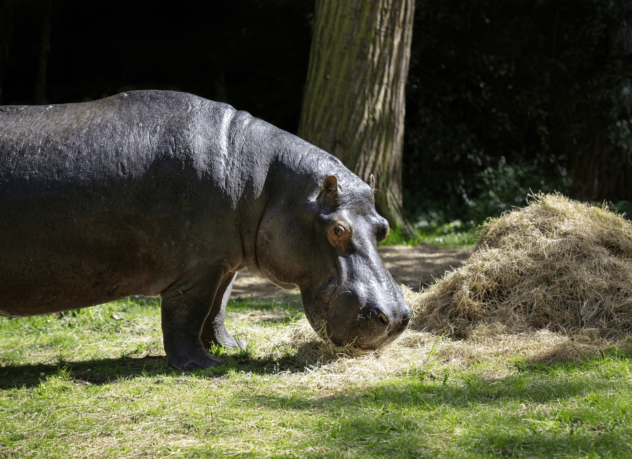 Hippos are herbivores (plant-eaters) and mainly eat grass. They leave the water at night to graze for 4-5 hours in grassy areas near the water. While they prefer to eat near the water, they will travel several kilometres to find food if they need to. Hippos have also been observed on a few occasions eating dead animals, however, their bodies are not suited to eating meat so this is likely not a common behaviour.
