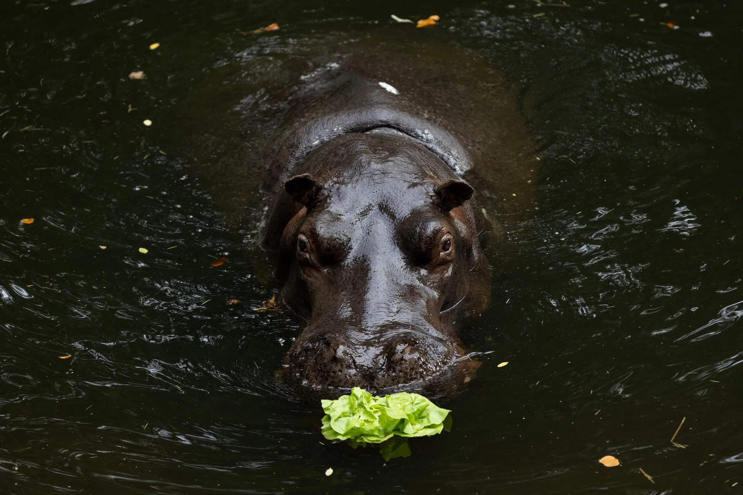 Hippos are herbivores (plant-eaters) and mainly eat grass. The leave the water at night to graze for 4-5 hours in grassy areas near the water.