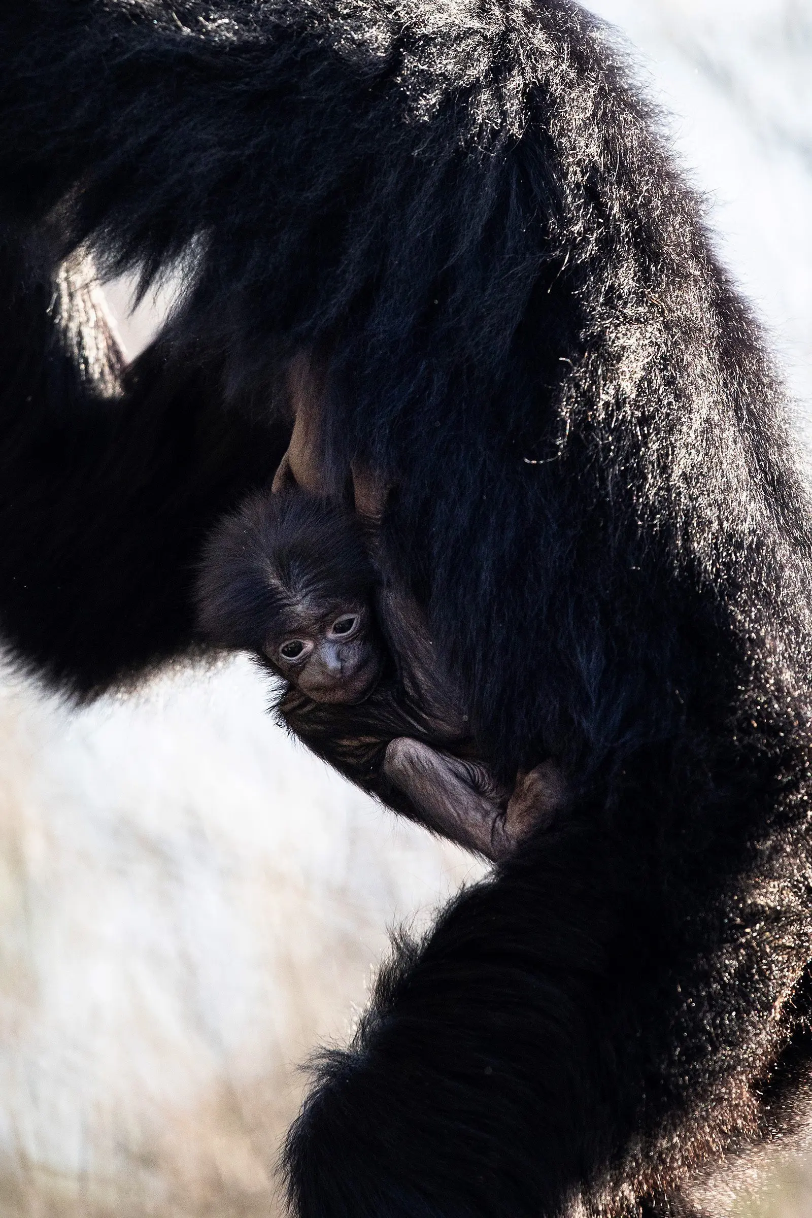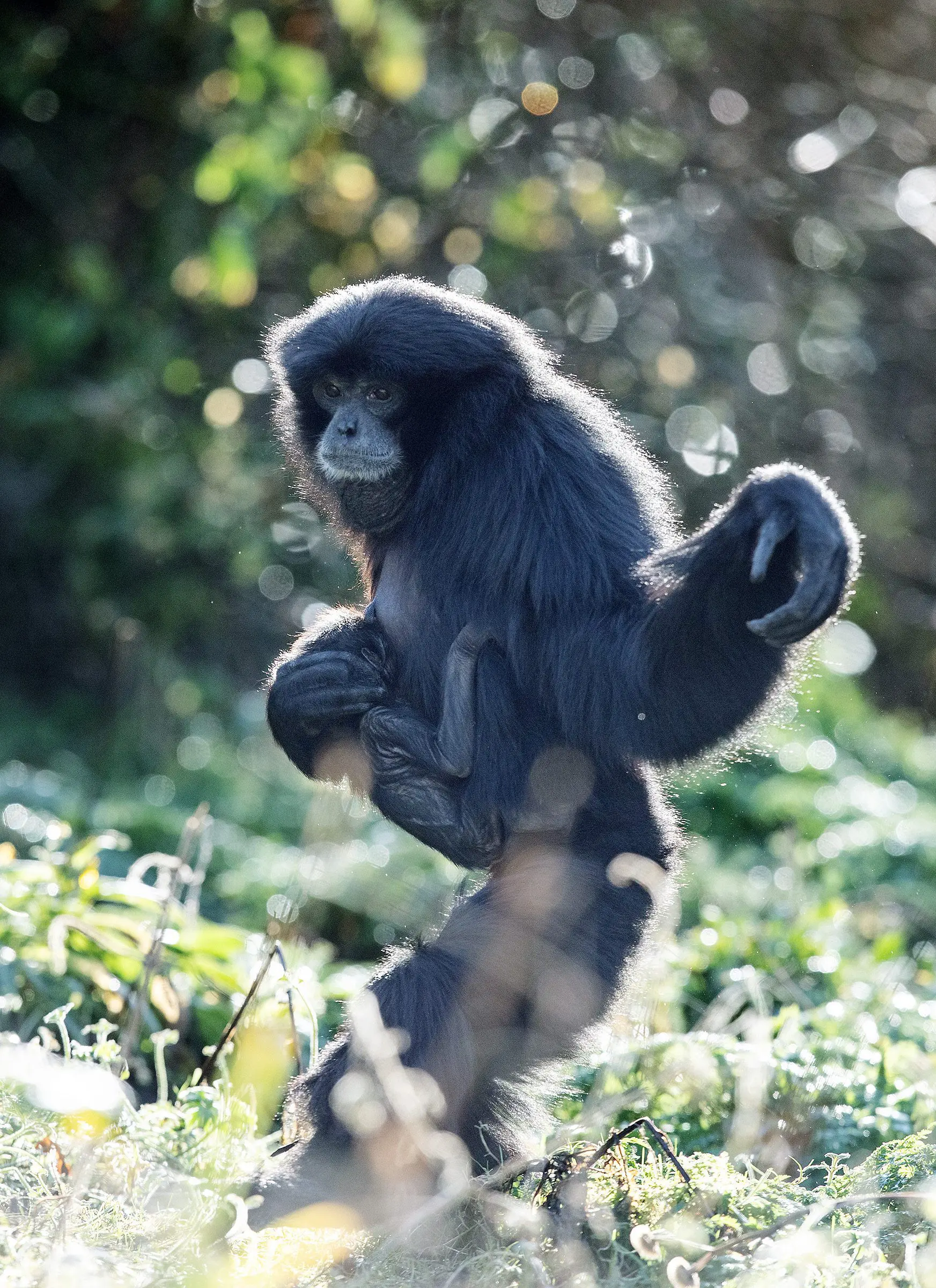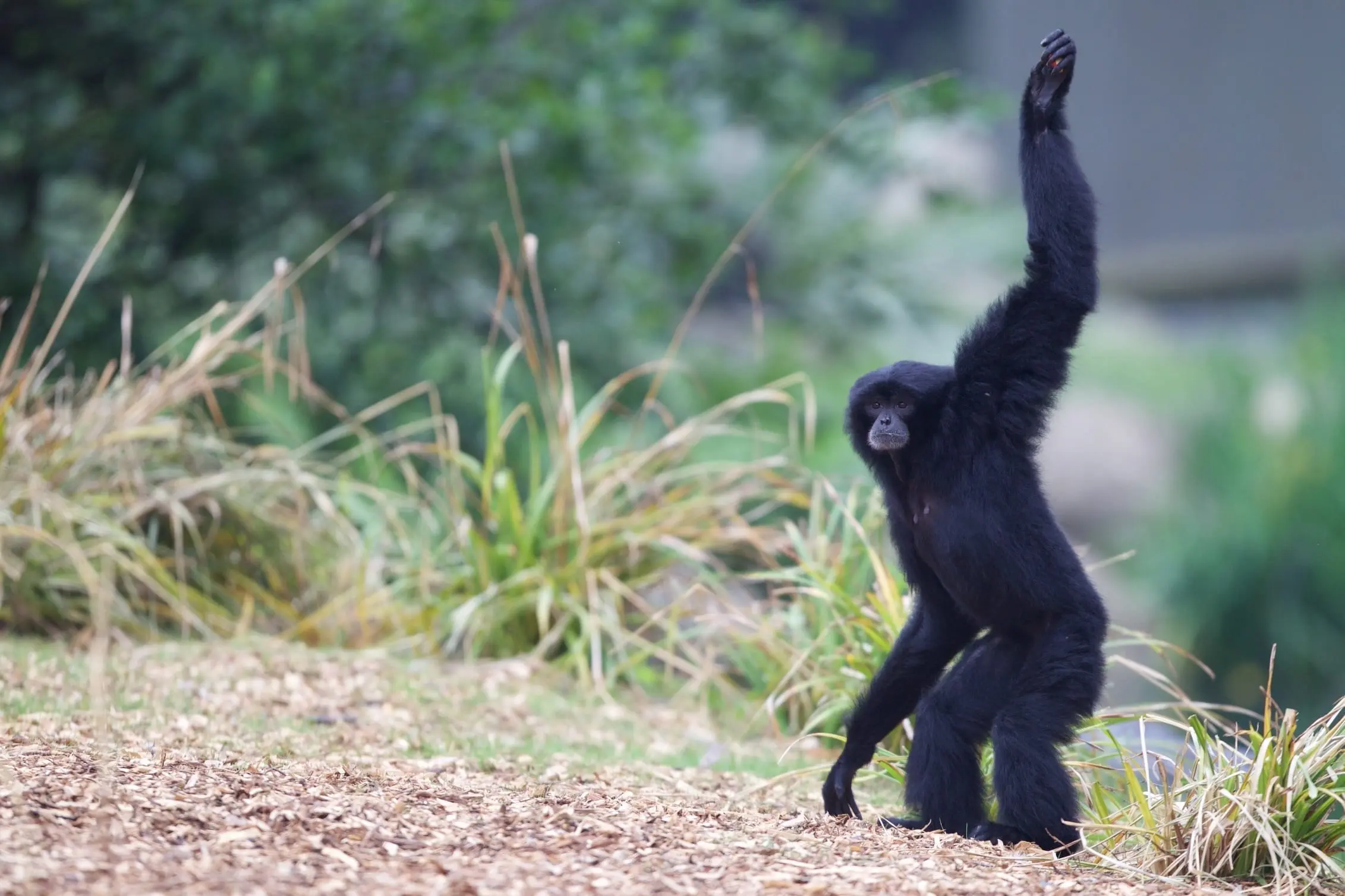Siamangs use their long arms for swinging through the trees (brachiating) and for balance when walking on two legs.