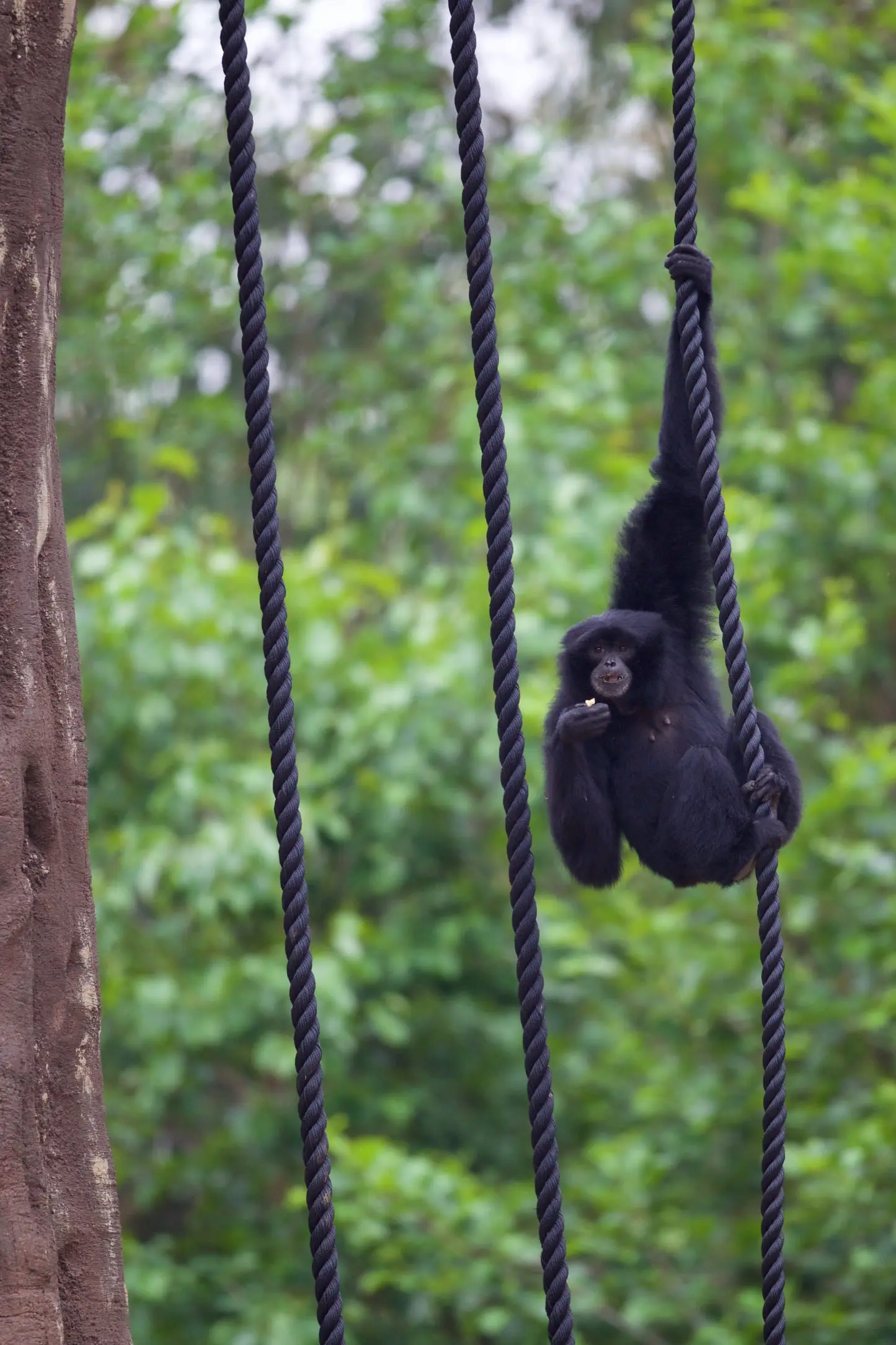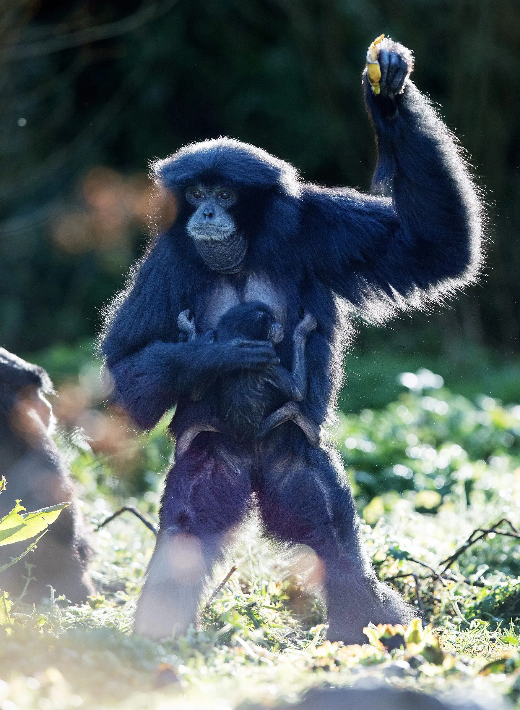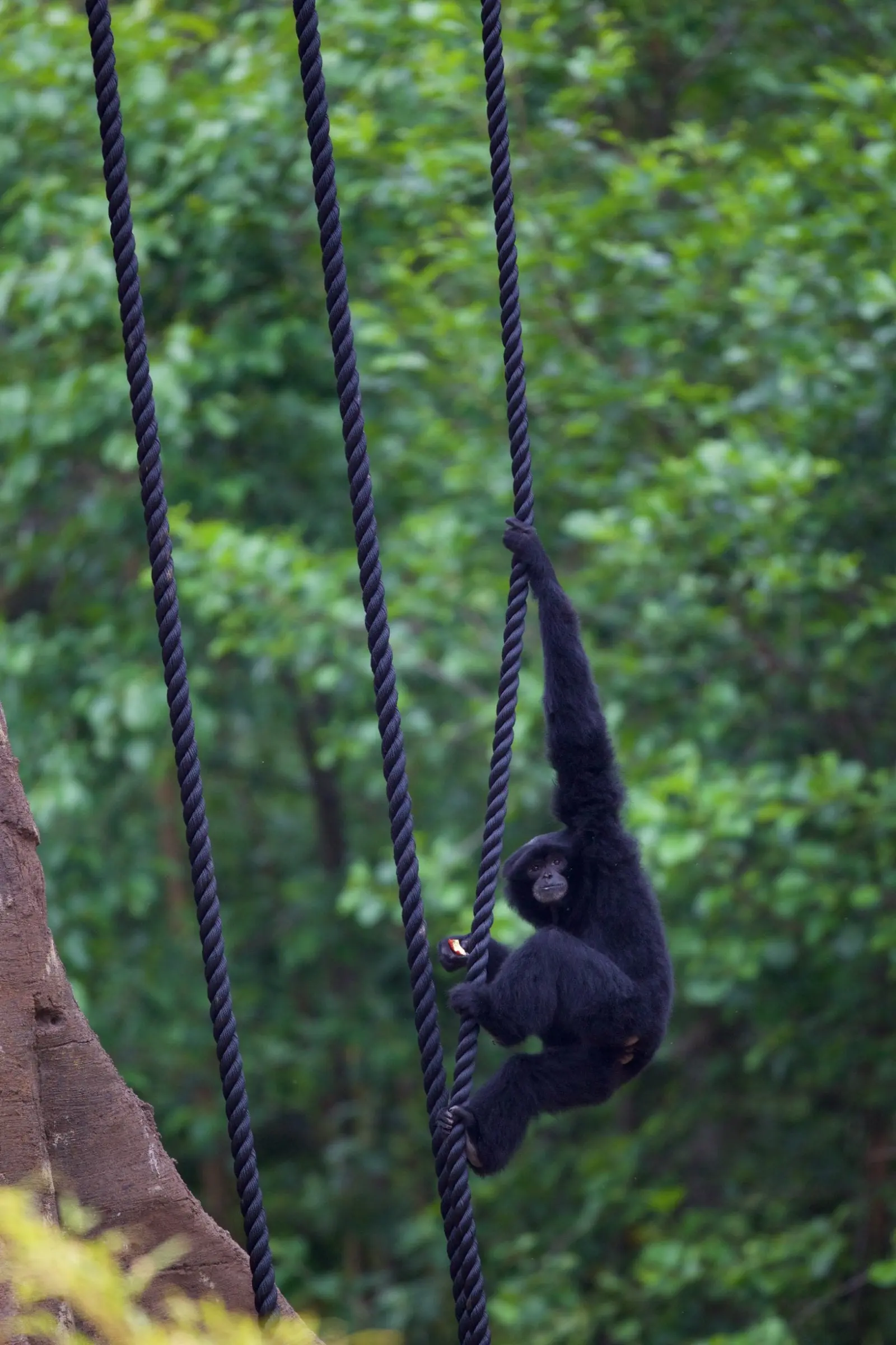 Siamangs can generally be found swinging through the trees, but they can walk when on the ground.