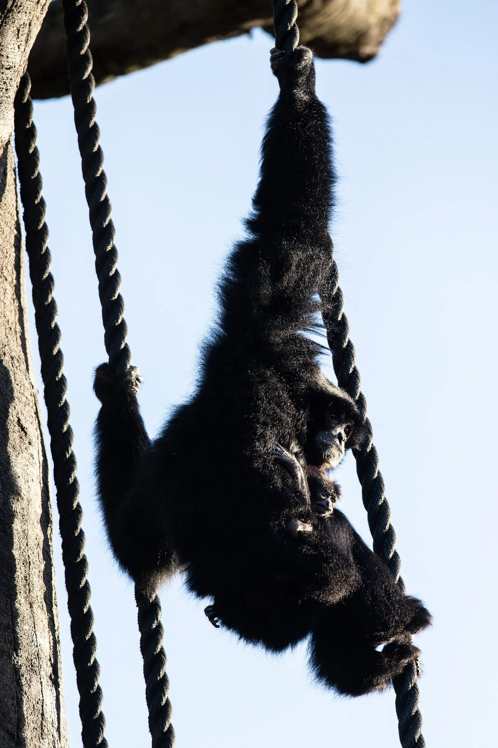 Siamang gibbons are the largest of the gibbon species, a group of ‘lesser’ apes found in Asia. Siamang gibbons have black shaggy fur and very long arms, which they use for swinging from branch to branch. They have large throat pouches which inflate to allow them to vocalise and sing.